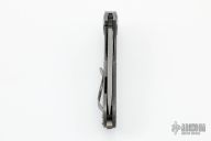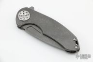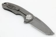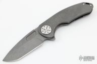 This F3 Medium by Curtiss Knives features a stonewashed blade with notched thumbrest and flipper. The handle has a tumbled titanium frame with a matching tip up titanium clip. Satin stainless hardware. Rides on bearings, nice detent and lockup.  Comes with original box, zipper case, COA, patch and sticker pack. Excellent condition.