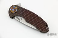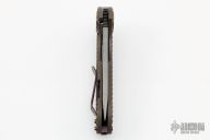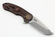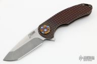 This F3 Medium by Curtiss Knives features a stonewashed blade with notched thumbrest and flipper. The handle has an anodized frag milled titanium frame over notched titanium backspacer, matching titanium tip up clip. Smooth and fast opening using a Caged Bearing System. Has a stainless lockface insert. Nice blade seating, detent and lock up. Includes padded and zippered case. Has a light detent. Excellent condition.