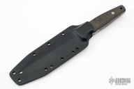 This Cuda CQB1 is a Bob Terzuola design executed by Camillus. It features a bead blasted spear point blade with false top edge, notched thumb ramp, .167" blade stock and 1.320" blade depth, full tang construction. The handle is comprised of green canvas micarta scales with lanyard hole over notched tang. Includes kydex sheath with Tek-Lok, original box and papers. Has a few light scuffs on the blade, otherwise excellent condition.