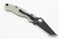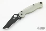 This G81GM4BKP2 Paramilitary 2 by Spyderco features a black tanto blade with thumb hole, notched thumb ramp and choil. The handle has a textured jade G10 scales over a stainless steel subframe and lockbar. 4 way adjustable pocket clip and lanyard tube in pommel. Includes original box and paperwork. Excellent condition.