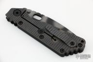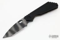 This MSC SMF framelock folder by Mick Strider features a tiger striped tanto blade and a dimple pattern black aluminum and flamed titanium frame and tip up titanium clip. Includes Hinderer "Lock Bar Stabilizer" for maximum reverse lock retention. Nice detent, lockup and blade seating. New condition.
