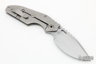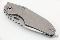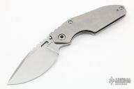 This XL Jibble by Mick Strider features a stonewashed blade with notched thumbrest and a thumbhole. The handle has a stonewashed titanium frame with tip up reversible clip. Nice detent, lockup and blade seating. New Condition.