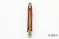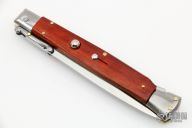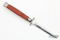 This 11" Swing Guard Auto by Frank Beltrame features a polished dagger ground blade with false top edge. The handle has stainless steel bolsters, front and rear, cocobolo scales, brass liners, stainless spring. Excellent Condition.