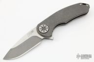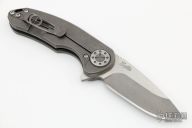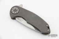 This F3 by Curtiss Knives features a two-tone stonewashed blade with notched thumbrest and flipper. The handle has a tumbled titanium frame with a matching tip up titanium clip. Satin stainless hardware. Rides on bearings, nice detent and lockup.  Comes with original zippered case. Excellent condition.