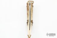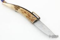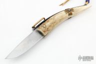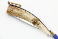 This Ring Pull by Idaho Knife Works features a satin finished blade. The handle is a piece of stag antler tine with steel spring, brass ring and fittings. Solid lockup, nice blade seating. Comes with a leather pouch. Has some scratches, otherwise excellent condition. Pretty cool knife! Comes with COA dated Jan 2012.