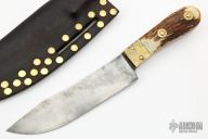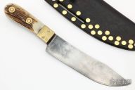 This Buffalo Hunter from Mike Mann and Idaho Blade Works features .220" blade thickness and 1.650" blade depth, full tang construction. The handle has brass bolsters inlaid into stag scales with brass pins. Includes black leather sheath with belt loop and brass studs. Has some patina, otherwise excellent condition. Comes with COA dated Feb 2012