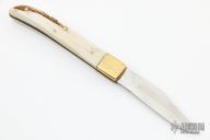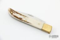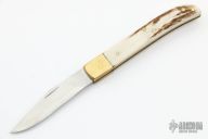This Slipjoint by Larry Arnold features a clip point blade with nail nick. The handle is comprised of brass bolsters and elk antler covers over brass liners and steel backspring. Has some scratches, otherwise good condition.