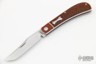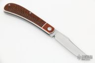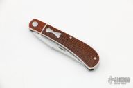 This Trapper by Enrique Pena features a hand rub satin finished blade with nail nick. The handle has natural canvas micarta bolsters, burlap micarta covers over white G-10 liners, stainless steel escutcheon, liners and spring. Half-stop, flush in all positions. Comes with a zippered case. Has a couple light scratches, excellent condition otherwise.
