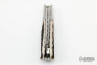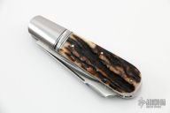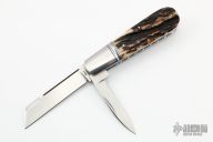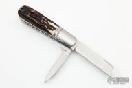 This two-blade Barlow by Bill Ruple features two hand rub satin finished blades with nail nicks. The handle has stainless steel bolsters, stag covers, fileworked stainless steel liners, stainless steel springs. Half stop blade positioning on both blades, flush in all positions. Includes a padded zippered case. Excellent condition.