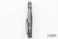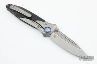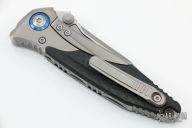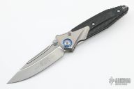 This Socom Bravo by Microtech is made in China by Rike Knife, it features a bead blasted blade, notched thumbrest, and dual thumbstuds. The handle has bead blasted titanium bolsters/liners, blue anodized pivot collars, carbon fiber scales. Tip up carry bead blasted titanium clip. Bead blasted titanium backspacer. Dated 01/2022 and s/n 0381. Comes with original box and papers. Excellent condition.