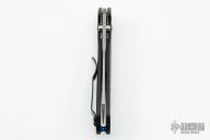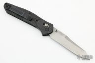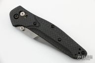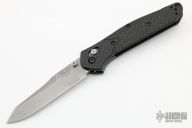 The Warren Osborne designed Benchmade 940 is a popular knife for good reason. It's a comfortable everyday carry knife with its slim design, great ergonomics and lightweight. The 940-1 has a premium CPM-S90V steel blade with a plain edge and a stonewash finish. The carbon fiber handle has stainless steel liners and blue anodized aluminum barrel spacers. The AXIS lock and reversible pocket clip make the knife usable for right and left handers. Attached deep carry clip. Has been resharpened, otherwise excellent condition.