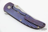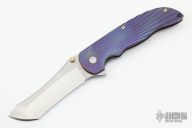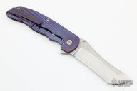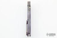 This Norseman (#4812) by John Grimsmo features a tumbled blade with a single anodized titanium thumb stud, notched thumb ramp and flipper. Anodized finished and Starburst 2.0 textured titanium frame with anodized titanium screws. Very smooth action that requires no wrist movement. Nice detent, lockup and blade seating. Rides on ceramic bearings. Knife is in excellent condition, shows no signs of use or carry. Comes with original packaging, custom hard case, Nano-Oil and tool.