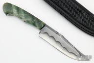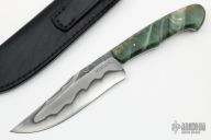 This Camp knife by Milan Mozolic features a hand rub satin finished W5 Tool Steel blade with forge finished flats and beautiful hamon, .167" blade stock and 1.496" blade depth, full tapered tang construction. The handle has stabilized figured maple scales with stainless steel pins. Comes with a hand tooled black leather sheath. Comes with COA. New from maker!