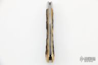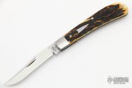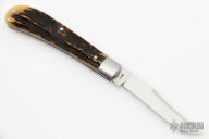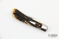 This Serpentine Trapper by Tony Bose features a satin finished blades with a single nail nick, pinched stainless steel bolsters, and stag covers over stainless steel liners and stainless steel backsprings. Stainless steel escutcheon. Half stop flush in all positions. Includes a padded zippered case. There are a couple of very light scratches on the blade otherwise the knife is in Excellent Condition.