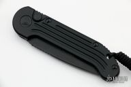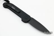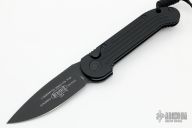 This LUDT side opening automatic by Microtech has a black blade with a standard edge and a black aluminum frame. This tactical version has black fittings. Stainless steel clip. Dated 05/2022 and serial number 26622. Comes with original box and sheath. Excellent condition.