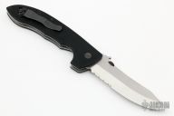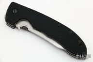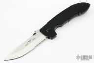 This Super CQC-8 by Emerson Knives features a tumble and satin finished partially serrated blade with thumb disc and wave feature. Black G-10 scales over titanium liners. Lanyard hole in pommel and black coated stainless steel tip up clip. Comes with original box and papers. Excellent condition.