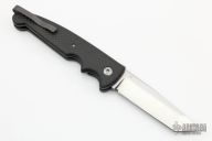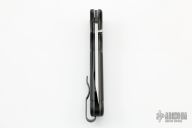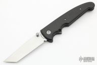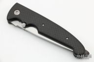 This tanto linerlock by John Kubasek features a hand rub satin finished chisel ground blade with notched thumbrest and a single checkered thumbdisc. The handle has carbon fiber scales, bead blasted titanium liners and tip up clip, carbon fiber backspacer. Nice detent, lockup, action and blade seating. Comes with a zippered case. New from maker.