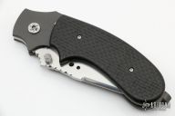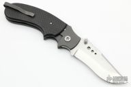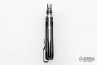 This linerlock by John Kubasek features a hand rub satin finished blade with notched thumbrest and fileworked spine, dual checkered thumbstud. The handle has lightning strike carbon fiber scales, bead blasted titanium liners and tip up clip, green canvas micarta backspacer. Nice detent, lockup, action and blade seating. Comes with a zippered case. New from maker.