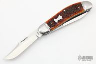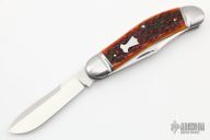 This 2-blade Sowbelly by Richard Rogers features satin finished blades with nail nicks. The handle has fluted stainless steel bolsters with integral liners, stainless steel springs, jigged bone covers with a stainless steel escutcheon. Beautiful fit and finish. Comes with a leather pouch. Excellent condition. Made in 2011.