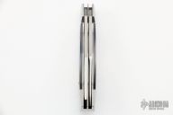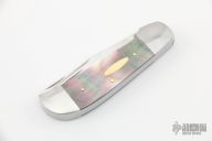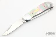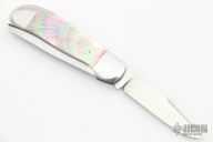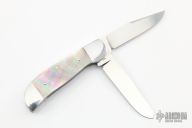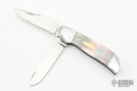 This Model 7 by Tommy Overeynder features two hand rub satin finished blades with nail nicks. The handle has stainless bolsters with integral liners, black lip pearl covers, stainless springs and a gold escutcheon and pins. Half-stop on blades, flush in all positions. #002 on blade. Comes with leather pouch and COA dated April 16th, 2009. Excellent condition.