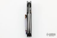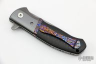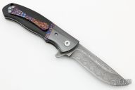 This Torrent 3.0 flipper by DB Fraley features a Damasteel blade with flipper. The handle has zirconium bolsters, carbon fiber scales, timascus spacers and tip up clip with Lost Souls carving, titanium liners, zirconium backspacer with Lost Souls carving. rides on bearings, nice detent, lockup and blade seating. Comes with a leather case and COA. Excellent condition.