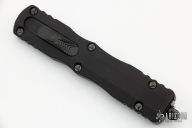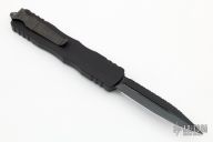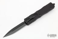 This Dirac Delta OTF automatic by Microtech features a D/E DLC finished blade with a fully serrated edge. The handle is DLC aluminum with a stainless steel tip down clip. Serial number 105 and dated 11/2021. Comes with original box and papers. Excellent Condition.
