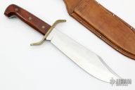 This W49 Bowie by Western Cutlery features a mirror polished bowie blade with a false top edge, .171" blade stock and 2.126" blade depth, full tang construction. The handle has a brass s-guard, wood scales with brass pins. Comes with a brown leather sheath. Has some scratches and patina, otherwise good condition. The sheath is stamped "WJO US 513 1st A" but the "3" is backwards, so it might be an "E".