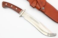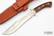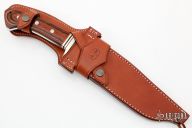 This Grizzly Bowie by Tak Blades features a satin finished, recurved bowie style blade with swedge and fullers, .243" blade stock and 1.751" blade depth, hidden/frame tang construction. The handle is comprised of a nickel silver guard with nickel silver and red and black fiber spacers, dymondwood scales with Grizzly Paw shield and nickel silver pins over full tang construction. Brass lanyard tube in pommel. Includes leather sheath with belt loop. Has a few very light scratches, otherwise excellent condition.