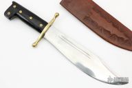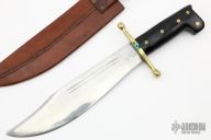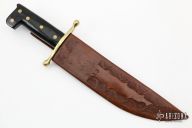 This No. 18 Bowie from Collins & Co. features a clip point recurve blade with a partially sharpened top edge, .162" blade stock and 2.045" blade depth, hidden tang construction. The handle has a brass double guard and black wood handle. Includes brown leather sheath with belt loop. This knife has some light scratches, but overall excellent condition.