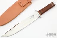 This Tor by Fallkniven features a satin finished VG10 laminated steel blade in convex grind and hidden tang construction. Blade is .273" thick and 1.663" deep. The handle has a stainless steel guard, stacked leather handle with black, red, and white spacers, and an aluminum butt cap. Comes with a brown leather sheath with belt loop. Excellent condition.