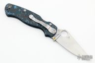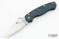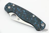 This Paramilitary 2 Linerlock Folder from Spyderco has a satin finished clip point blade with thumbhole and notched thumb rest. Handle has black/blue carbon fiber scales with nested stainless steel liners and stainless steel clip, custom black hardware. Comes with original box and papers. Excellent condition.