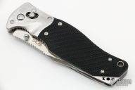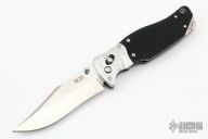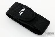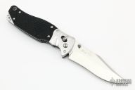 This SOG TomCat Axis Lock Folder has a VG-10 blade with dual thumb studs and a notched thumbrest. Handle is black rubber with satin finished stainless steel bolsters over stainless steel frame with notched thumb rest and black fiber back spacer. Has lanyard tube pin. Comes with SOG nylon velco sheath and original box. New condition. Still has plastic covers on the bolsters.