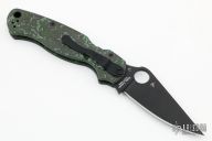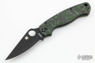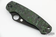 This Paramilitary 2 Linerlock Folder from Spyderco has a black finished clip point blade with thumb hole and notched thumb rest. Handle has black/green Fat Carbon scales with stainless steel liners and stainless steel 4-way reversible clip. Comes with original box and papers. Excellent condition.