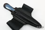 This Sleeve Dagger by Kelly Carlson features a mirror polished chisel ground double edged blade with satin finished flats, .165" blade stock and .725" blade depth, full tang construction with a blued mosaic Damascus scale on one side. The scale is attached from the back side with three fileworked screws. Comes with a black leather sheath that could be attached to your arm or leg. Has a few light scratches, otherwise excellent condition.