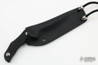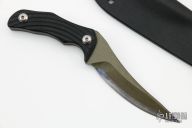 This M-19 Neck Knife by Warren Thomas features chisel ground titanium blade with green G-10 laminate, carbidized edge and finger print anodized, .210" blade stock and .775" blade depth, full tang construction. The handles black G-10 scales. Comes with kydex sheath. Has been resharpened, otherwise good condition.
