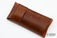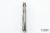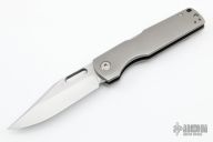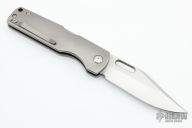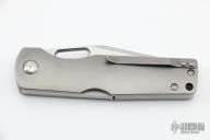 This Specialist lockback by Jim Burke features a hand rub satin finished blade with thumbhole. The handle has a blasted titanium frame with tip up titanium clip, orange peel finished titanium backspacer, matte finished stainless steel lockbar. Has a couple very light scratches, otherwise excellent condition. Comes with a leather pouch.
