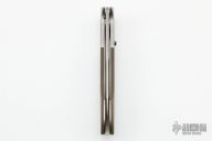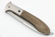 This Auto by Chuck Gedraitis features a stonewashed blade with false top edge. The handle has orange peel finished titanium bolsters, zirconium button, green canvas micarta scales, orange peel finished titanium liners and backspacer. Nice action, lockup and blade seating. Comes with a zippered case and COA. Excellent condition.