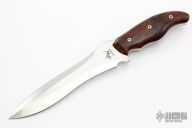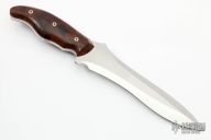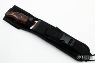 This Sniper from Mercworx features a hand rub satin finished drop point, recurved blade with sharpened top edge and notched thumb ramp, .245" blade stock and 1.980" blade depth, full tang construction. The handle is comprised of desert ironwood burl scales with mosaic pins and red liners. Includes tactical nylon sheath. Excellent condition.