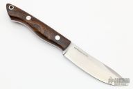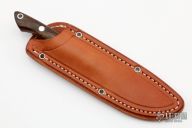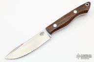 This Mini Kalahari by Bark River Knives features a satin finished blade with .135" blade stock and .894" blade depth, full tang construction. The handle has desert ironwood scales with red liners and a lanyard hole. Comes with brown leather sheath and original box. Excellent condition. First Production Run