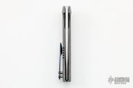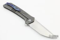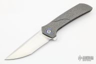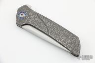 This Cetus by Walter Randolph features a hand rub satin finished blade with false top edge and a notched flipper. The handle has a two-tone stippled titanium frame with a black timascus tip up clip, floating backspacer and pivot collars. Nice action, detent, and blade seating. Comes with COA dated 1-25-2019 and a Velcro case. Excellent condition.
