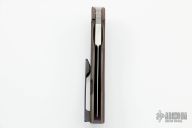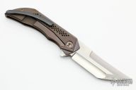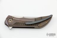 This Phantom by Merriken Knives features a satin finished blade with notched thumbrest and flipper. The handle has a tumbled and anodized titanium frame with orange peel finished edges and backspacer, zirconium tip up clip with hidden screws. Comes with Velcro case. Rides on bearings, nice detent, lockup and blade seating. Excellent Condition.