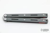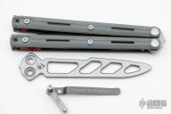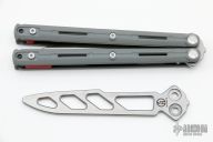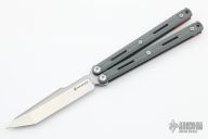 This Balisong by Maxace Knives features a satin finished blade with false top edge. The handle has grey G10 scales over a blasted steel frame, red G10 backspacers, tip up clip and T-latch. Comes with original zippered case with trainer blade and optional clip and t-latch. Excellent Condition.