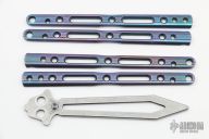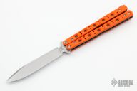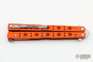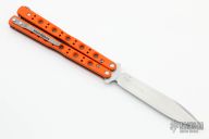 This Model 51 Morpho Balisong from Benchmade has a tumble finished D2 stainless steel spear point blade. Handle is orange G10 with beadblast liners and matching titanium tip up clip. Comes with original box, papers, purple screw set, Flytanium Scales and Trainer Blade. Has a couple light scratches on the Flytanium scales, otherwise excellent condition.