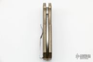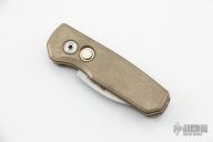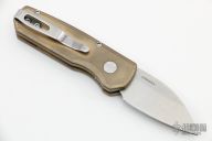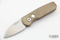 This Runt 5 by Pro-Tech features a stonewashed blade. The handle has a stonewashed brass frame, a stainless steel tip up pocket clip and a mother-of-pearl inlaid push button. Includes the original box and papers. Excellent condition.