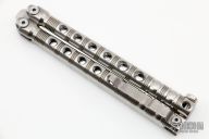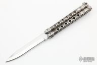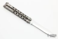 Proudly introducing the Piranha Swinger balisong knife! The Swinger has channel titanium handles with a stonewashed titanium pocket clip. A mirror-finished 154CM stainless steel blade makes the Swinger stand out in the best ways: cutting performance and raw good looks. Whether you're a long-time knife collector or just getting started, this knife is one you'll be proud to have in your pocket. Made in the USA! Comes with original box and papers. Has a few light scratches, otherwise excellent condition.