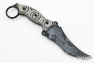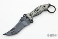 This Triceratops by the Busse features an urban multicam cerakoted blade with sharpened top edge, .207" blade stock, 1.785" blade depth, full tang construction with black/tan G-10 scales and a lanyard hole. New from maker.