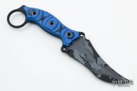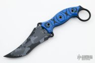 This Triceratops by the Busse features an urban multicam cerakoted blade with sharpened top edge, .207" blade stock, 1.785" blade depth, full tang construction with black/blue G-10 scales and a lanyard hole. New from maker.
