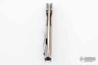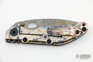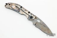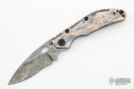 This DCG BBNL Framelock Folder has a desert digicam pike V-ground recurve blade with dual thumbstuds and thumbhole. Handle has a desert camo titanium frame, three color desert camo tip up clip, and titanium barrel spacers, custom black hardware. Centered blade and great lockup and detent with zero blade play. Comes with velcro case and COA. Excellent condition.