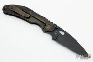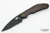 This DCG BBNM Framelock Folder has a black PVD recurve pike blade with dual thumbstuds and thumbhole. Handle has a black PVD titanium frame, titanium tip up clip, and titanium barrel spacers, custom bronzed hardware. Centered blade and great lockup and detent with zero blade play. Comes with Velcro case with COA written inside the flap Excellent condition.