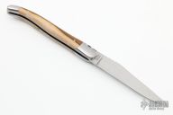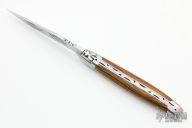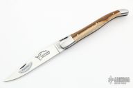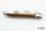 This knife features a satin finished blade with a nail nick and a fileworked thumbrest. The handle features stainless steel bolsters/liners over a steel backspring and pistachio wood covers, fileworked backspring. Excellent Condition. Comes with original box, sheath and papers.